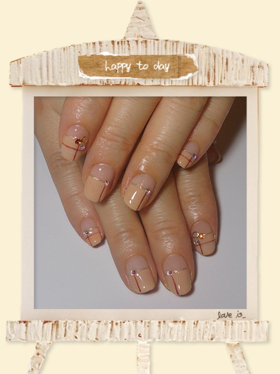 デザイン:ストレートフレンチ、チェック&ライン、ストーンのせ
